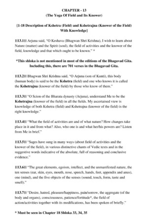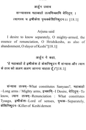 The eighteenth chapter of Shrimad Bhagavad Gita is a summary of the first seventeen chapters. This chapter not only summarizes but elaborates some points which were hinted at earlier. Therefore, if someone reads or understands this chapter, he/she will be able to understand Shrimad Bhagavad Gita in totality.